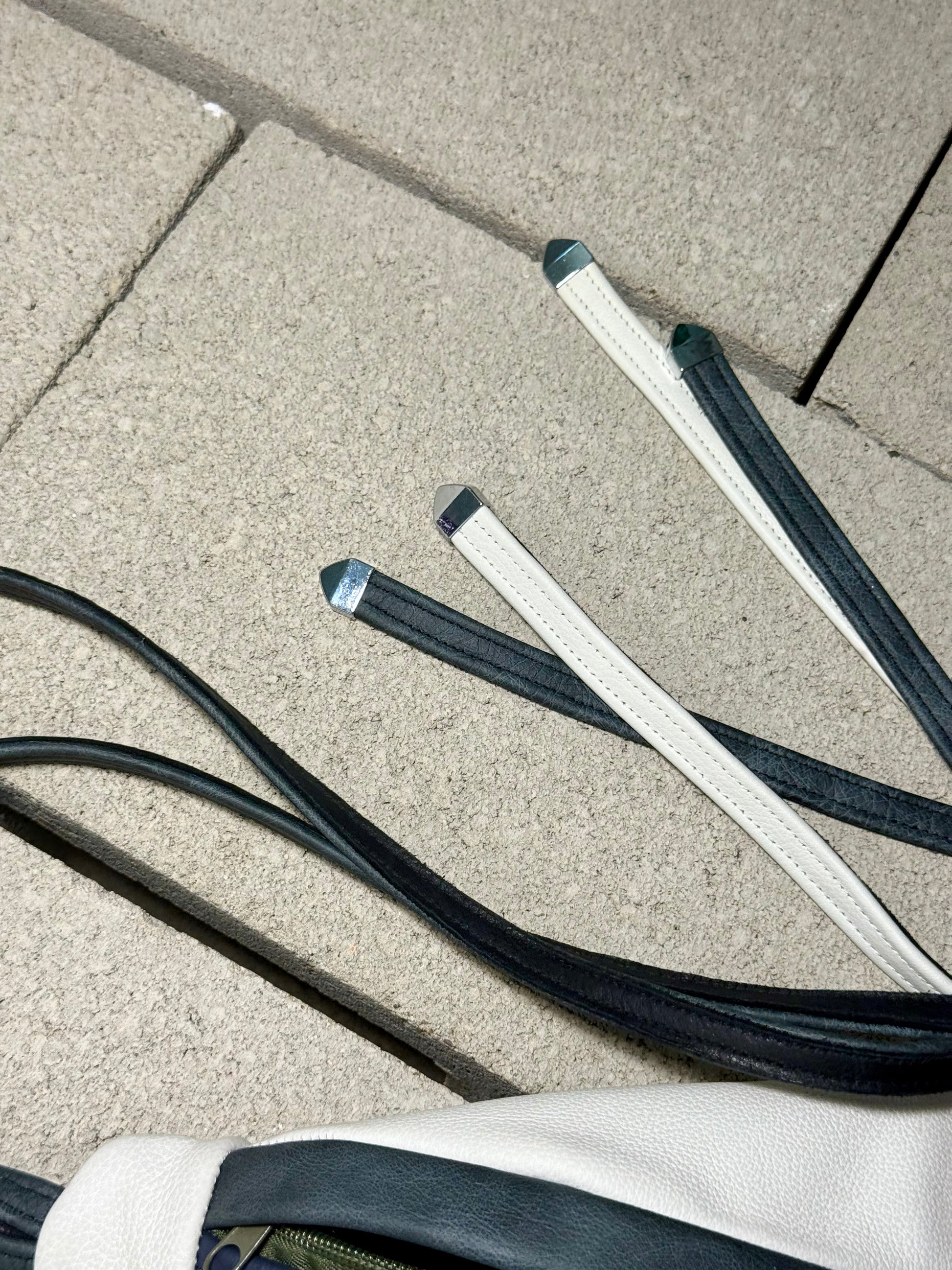 Hand-sewn leather straps, finished with metal tips