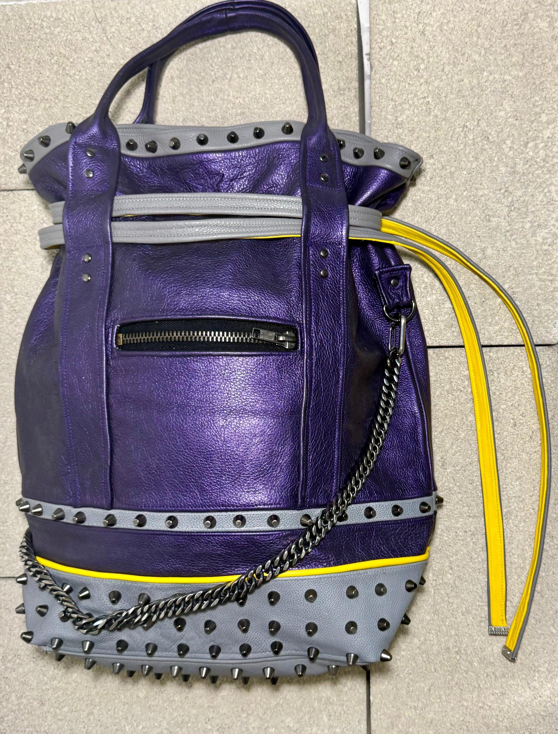 The signature SPACEMAN Tote gets a bold upgrade. Handmade from upcycled genuine leather, this one-of-one piece is finished with over 200 gun metal polished studs and a removable stainless steel crossbody chain for an industrial edge. Yellow leather piping outlines the silhouette, giving a sharp contrast to the hand-stitched body. The design balances utility with statement details, making it both functional and unmissable.